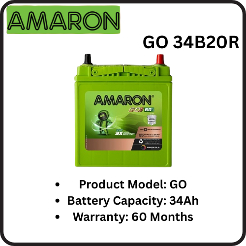 The Amaron GO 34B20R is a maintenance-free automotive battery engineered to deliver consistent starting power, long life, and dependable performance for everyday vehicles. Designed with advanced calcium alloy technology, this battery offers high cranking power, excellent vibration resistance, and reliable performance even in challenging Indian road and temperature conditions.